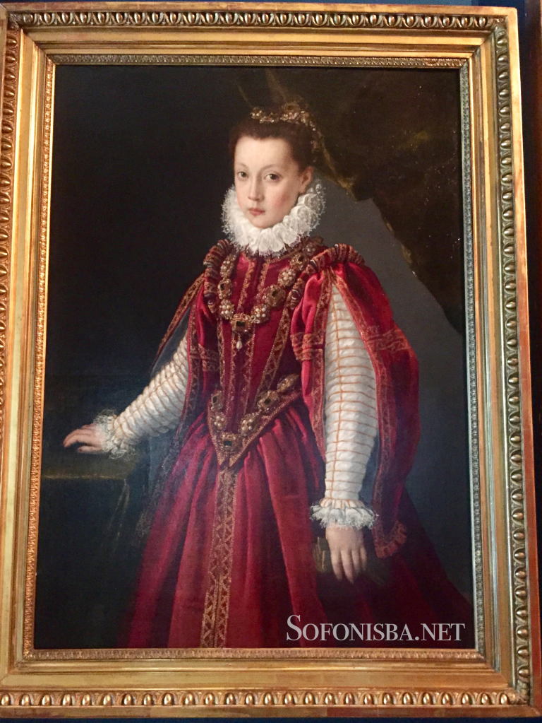That occasion was the opportunity for Sofonisba to paint Catalina Micaela that today is found in Sala 55 of the Prado, also attributed by the museum to Sofonisba’s competition, Sanchez Coello. And yet, my jaw dropped in Sala 55. The Catalina Micaela in Sala 55 echoes Sofonisba’s Lazaro Gallery portrait of Eleonora de Medici which Sofonisba had occasion to paint in 1580 when she was a surprise guest of Francesco de Medici in Tuscany. Like the eyes in the Lazaro Eleonora, the eyes in the Sala 55 Catalina Micaela call out to the viewer. The other portraits in Sala 55 peer out at the viewer.